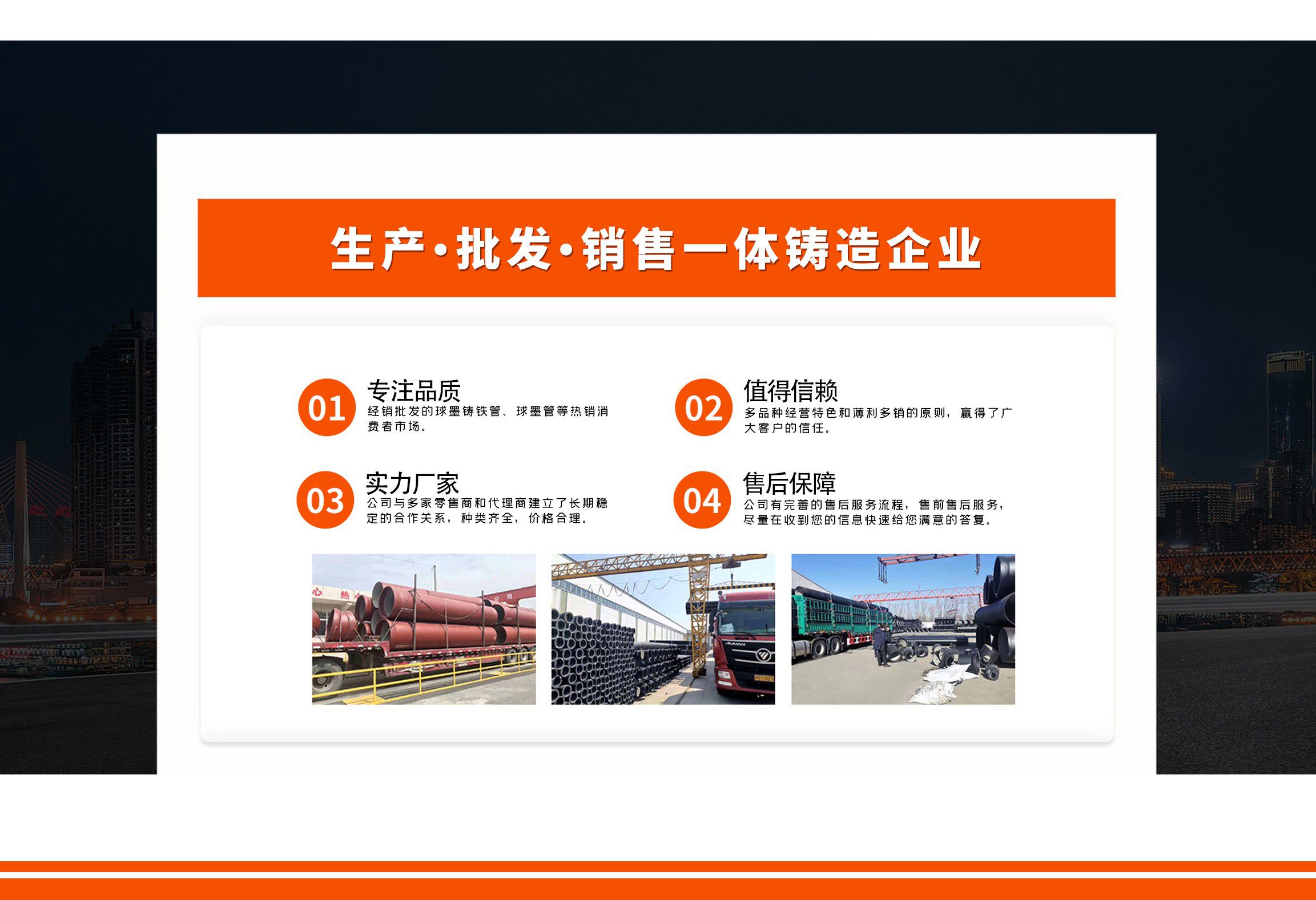 青島金源達(dá)管業(yè)有限公司主要經(jīng)營各種規(guī)格球墨鑄鐵管,球墨管,球墨鑄鐵管廠家等產(chǎn)品,質(zhì)量可靠,誠信經(jīng)營,值得信賴! 青島金源達(dá)管業(yè)有限公司始終堅(jiān)持“誠信立業(yè),追求卓越,合作共贏,共同發(fā)展”,竭誠歡迎各界朋友來廠參觀指導(dǎo),洽談業(yè)務(wù)。我們愿與您攜手共進(jìn),互惠雙贏,共創(chuàng)未來! 公司堅(jiān)持“以奮斗者為本”的理念,關(guān)心關(guān)愛職工,職工的獲得感、幸福感更加充實(shí)、更有保障、更可持續(xù);秉承“忠誠企業(yè)、勇于擔(dān)當(dāng)、開拓創(chuàng)新、主動(dòng)作為”,堅(jiān)持黨建領(lǐng)航、創(chuàng)新驅(qū)動(dòng)、文化塑魂、奉獻(xiàn)社會(huì),全面致力于綠色、低碳、高效、高質(zhì)量發(fā)展。 愿與各界朋友攜手并進(jìn),共創(chuàng)未來!...